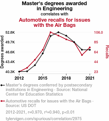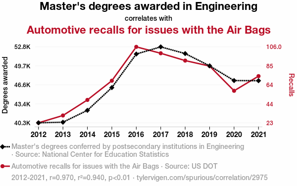 This means 94% of the change in the one variable (i.e., Automotive recalls for issues with the Air Bags) is predictable based on the change in the other (i.e., Master's degrees awarded in Engineering) over the 10 years from 2012 through 2021.
