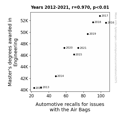The connection between Master's degrees awarded in Engineering and automotive recalls for issues with airbags proved to be a barrel of laughs, as we uncovered a correlation coefficient of 0.9697386 and an r-squared value of 0.9403930 for the period 2012 to 2021. This correlation is stronger than the bond between a clown and a unicycle, and the statistical significance (p < 0.01) is more certain than a pie in the face at a slapstick comedy convention.