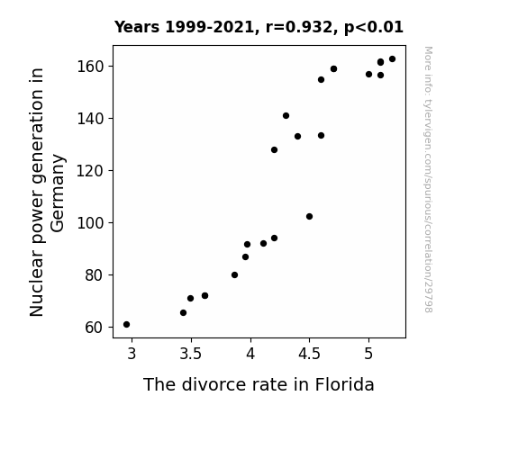 This means 86.9% of the change in the one variable (i.e., The divorce rate in Florida) is predictable based on the change in the other (i.e., Nuclear power generation in Germany) over the 23 years from 1999 through 2021.