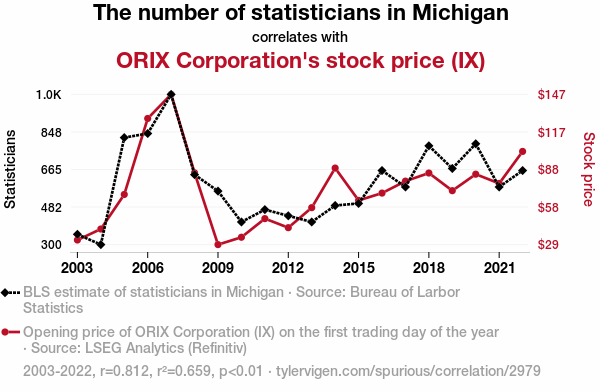 To decode the confounding correlation between the number of statisticians in Michigan and the whims of ORIX Corporation’s stock price, our research team embarked on a quest to concoct a data-fueled potion that would reveal the hidden secrets of statistical sorcery. Our potion was brewed using a blend of data extracted from the Bureau of Labor Statistics and LSEG Analytics (Refinitiv), from the illustrious years of 2003 to 2022.