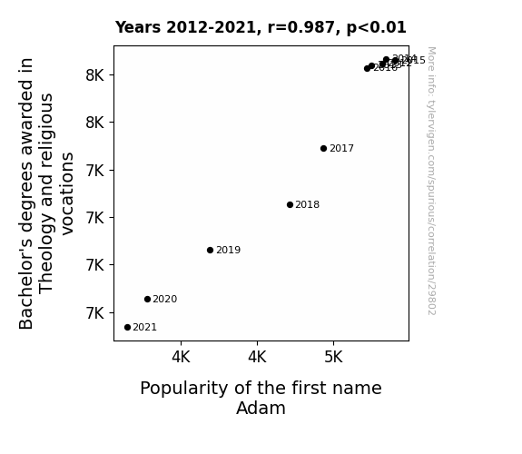 This means 97.4% of the change in the one variable (i.e., Popularity of the first name Adam) is predictable based on the change in the other (i.e., Bachelor's degrees awarded in Theology and religious vocations) over the 10 years from 2012 through 2021.