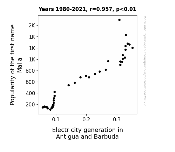 This means 91.7% of the change in the one variable (i.e., Electricity generation in Antigua and Barbuda) is predictable based on the change in the other (i.e., Popularity of the first name Malia) over the 42 years from 1980 through 2021.