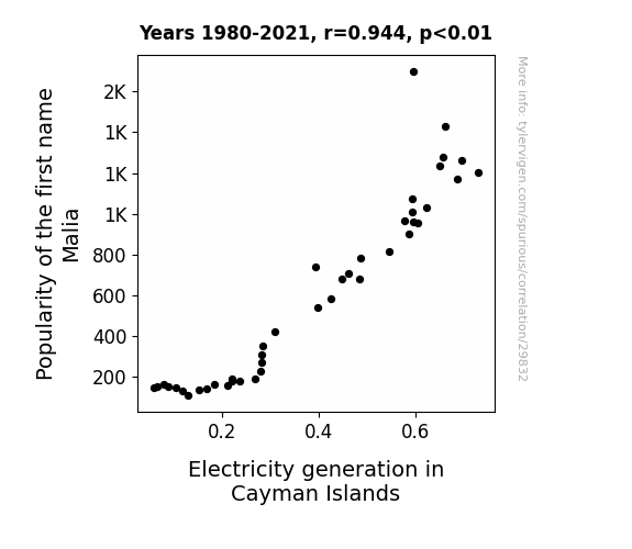 This means 89% of the change in the one variable (i.e., Electricity generation in Cayman Islands) is predictable based on the change in the other (i.e., Popularity of the first name Malia) over the 42 years from 1980 through 2021.