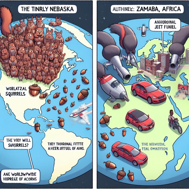 ChatGPT: Generate an image of a comical meme showing a map with a small town in Nebraska on one side and Zambia on the other. In the Nebraska area, show a comically exaggerated number of squirrels overtaking the town, with acorns scattered everywhere. Meanwhile, on the Zambian side, depict vehicles with jet fuel tanks, with a visual representation of global acorn shortage causing this switch. The image should emphasize the contrasting situations in these two locations due to the unexpected relationship between the local squirrel population and jet fuel consumption.