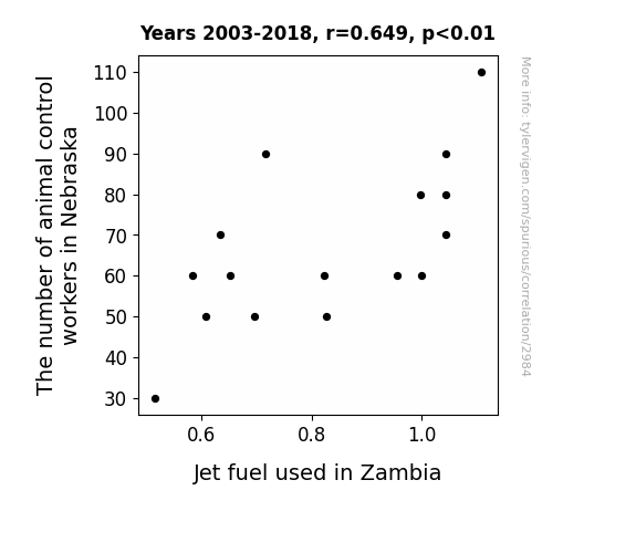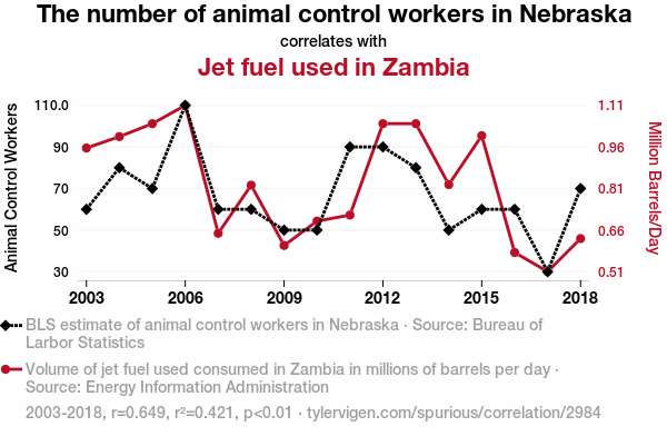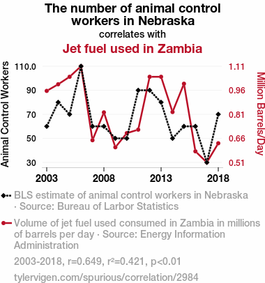 - The spurious research paper: Pawsing for Jet Fuel: An Unlikely Link Between Animal Control Workers in Nebraska and Jet Fuel Consumption in Zambia