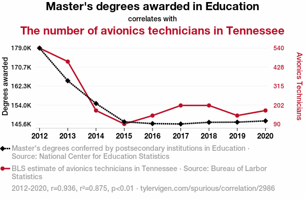 This means 87.5% of the change in the one variable (i.e., The number of avionics technicians in Tennessee) is predictable based on the change in the other (i.e., Master's degrees awarded in Education) over the 9 years from 2012 through 2020.