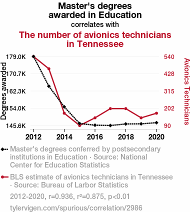 User prompt: Please provide potential search keywords for a paper titled Master's Degrees in Education and the Magnitude of Avionics Technicians in Tennessee: A Tenuous Tangle of Training? with an abstract of In this paper, we delve into a peculiar pairing, investigating the potential link between the number of Master's degrees awarded in Education and the population of avionics technicians in the delightful state of Tennessee. While the analogy may seem as incongruous as mixing airplane peanuts with library books, our research team navigated through troves of data from the National Center for Education Statistics and the Bureau of Labor Statistics to illuminate this curious correlation.