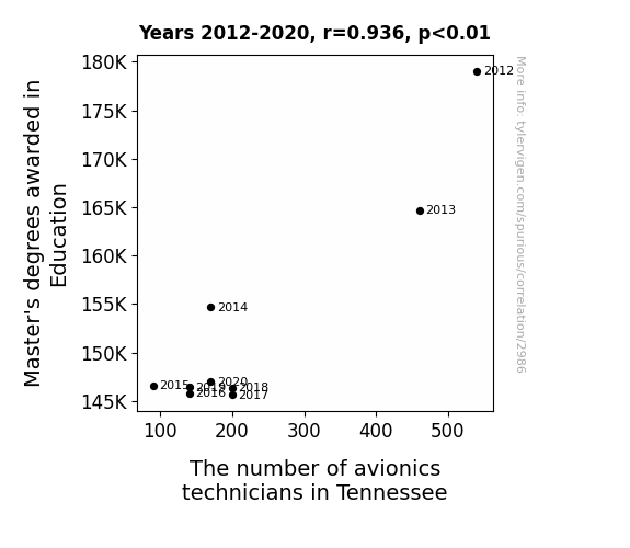 Our data analysis unearthed a rather baffling revelation: a substantial correlation between the number of Master's degrees awarded in Education and the magnitude of avionics technicians in the vibrant state of Tennessee. With a correlation coefficient of 0.9356670 and an r-squared value of 0.8754727, the strength of this relationship is as clear as day – or perhaps as clear as the skies over Memphis on a cloudless day.