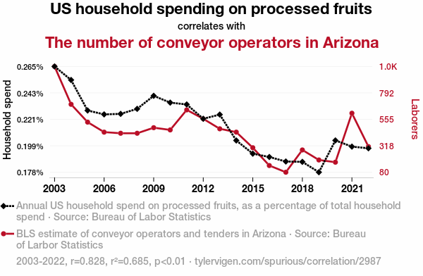 - The spurious research paper: The Peel Deal: Examining the Relationship Between US Household Spending on Processed Fruits and the Number of Conveyor Operators in Arizona