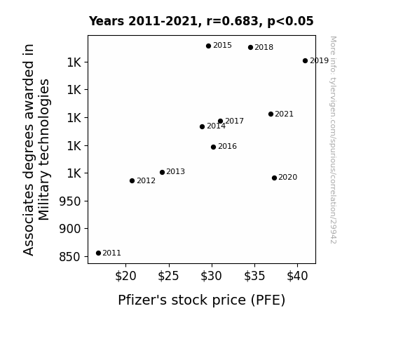 This means 46.7% of the change in the one variable (i.e., Pfizer's stock price (PFE)) is predictable based on the change in the other (i.e., Associates degrees awarded in Military technologies) over the 11 years from 2011 through 2021.
