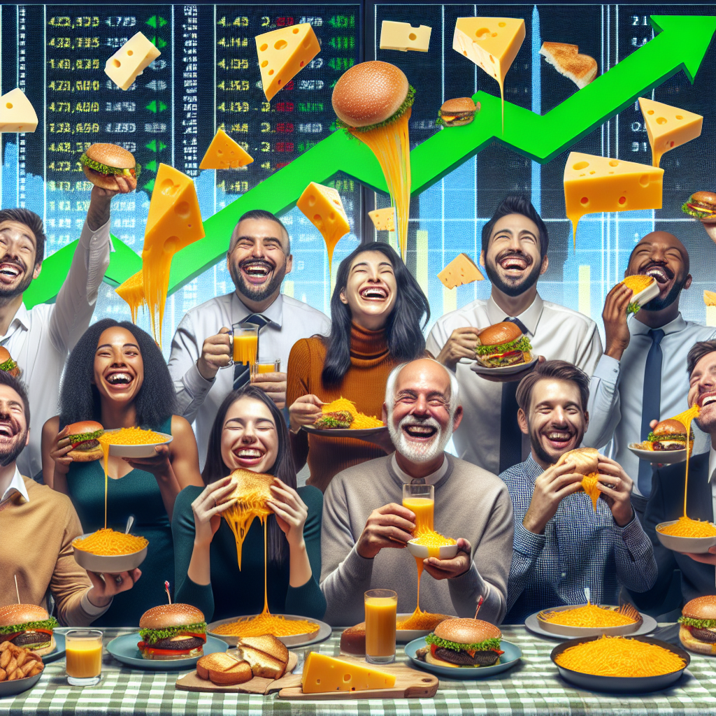 User prompt: Please describe a visual scene that prominently depicts both American cheese consumption and Agilent Technologies' stock price (A), in the following situation: As more people smothered their food in American cheese, they felt "grateful" for the savory experience. This increased their overall happiness which in turn led to more confidence in the stock market, including Agilent Technologies, causing their stock price to rise. It's all about that cheddar, baby!. Keep the description simple.