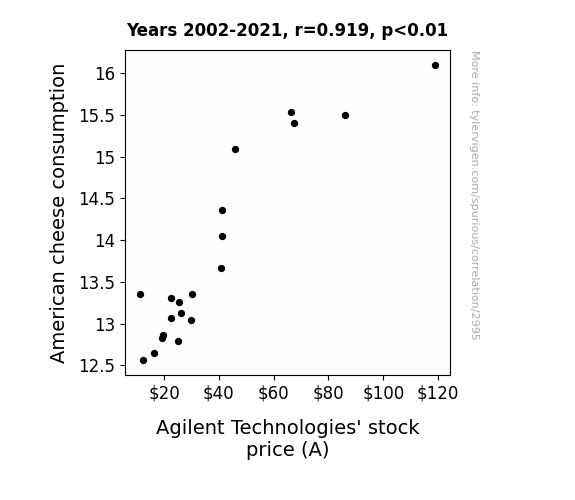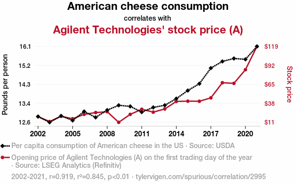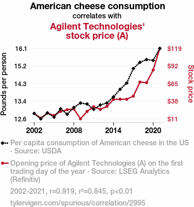 - The spurious research paper: Cheddar Economics: Uncovering the Quirky Link between American Cheese Consumption and Agilent Technologies' Stock Price