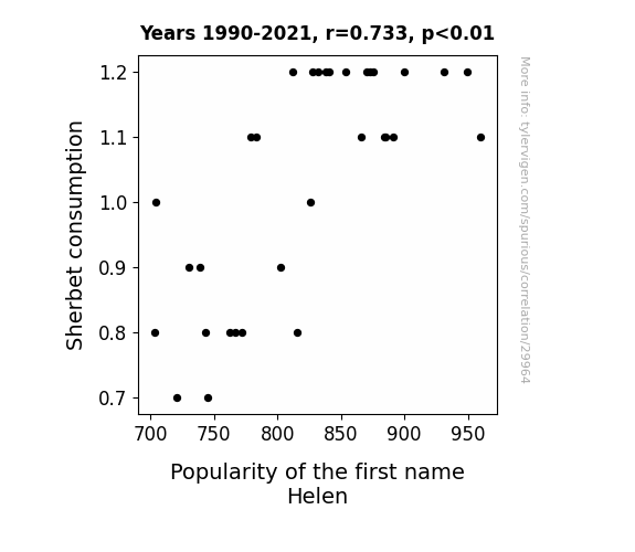 This means 53.7% of the change in the one variable (i.e., Popularity of the first name Helen) is predictable based on the change in the other (i.e., Sherbet consumption) over the 32 years from 1990 through 2021.
