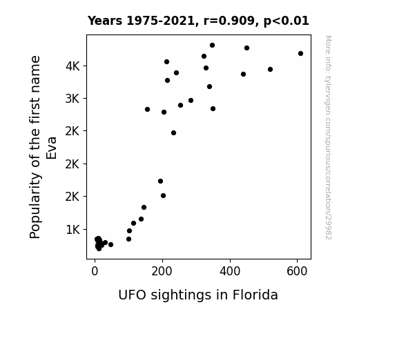 This means 82.7% of the change in the one variable (i.e., UFO sightings in Florida) is predictable based on the change in the other (i.e., Popularity of the first name Eva) over the 47 years from 1975 through 2021.