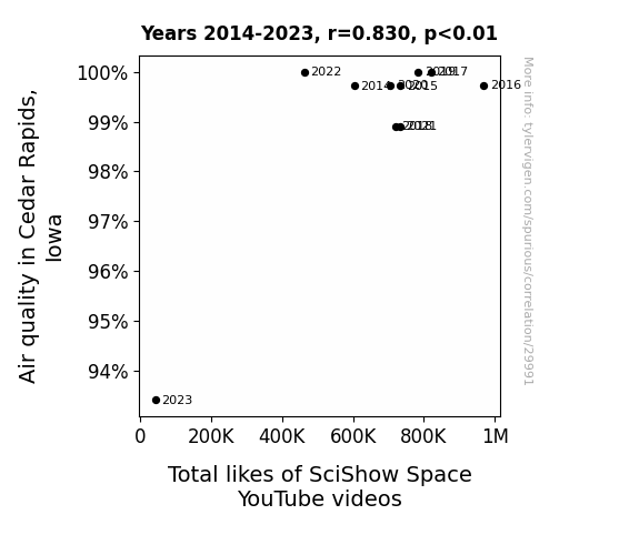 This means 68.8% of the change in the one variable (i.e., Total likes of SciShow Space YouTube videos) is predictable based on the change in the other (i.e., Air quality in Cedar Rapids, Iowa) over the 10 years from 2014 through 2023.