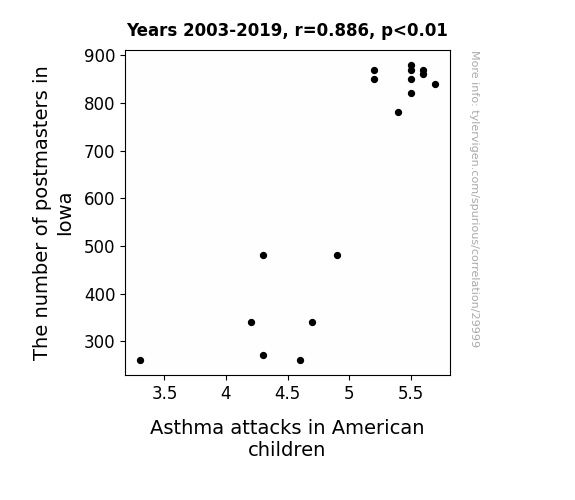 This means 78.5% of the change in the one variable (i.e., Asthma attacks in American children) is predictable based on the change in the other (i.e., The number of postmasters in Iowa) over the 17 years from 2003 through 2019.
