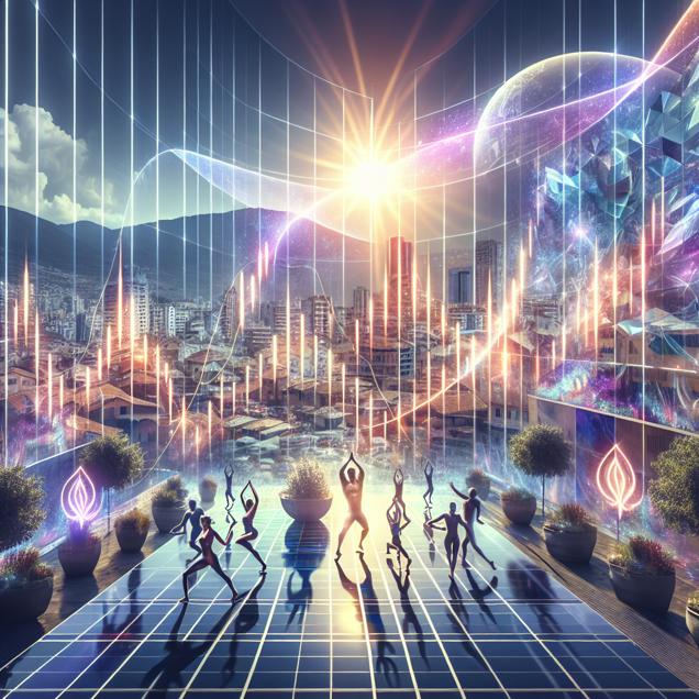 Prompt: [ Concept art ] In a bustling Albanian city, rows of sleek solar panels glisten in the bright sunlight, generating ample clean energy. The panels reflect the radiant sunlight with stunning iridescence, lending an almost magical quality to the scene. Meanwhile, a dynamic composition features a stock market graph for Lululemon, displaying a distinct upward trend with a rising chart resembling the graceful curves of yoga poses. Surrounding the graph, ethereal and translucent chakra symbols float in the air, reflecting the alignment of spiritual energies that are boosting demand for trendy athleisure wear. The cityscape serves as the backdrop, bustling with life while the clean energy and upward trend converge in a visually captivating display. The depiction should include only scenes, people, and objects, it should not include text or speech bubbles.