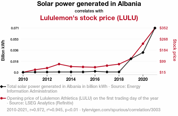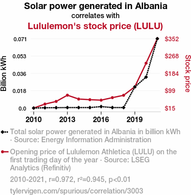 - The spurious research paper: Shining a Light on Solar Power: Illuminating the Relationship Between Albanian Solar Energy Generation and Lululemon's Stock Price