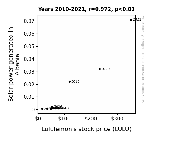 This means 94.5% of the change in the one variable (i.e., Lululemon's stock price (LULU)) is predictable based on the change in the other (i.e., Solar power generated in Albania) over the 12 years from 2010 through 2021.