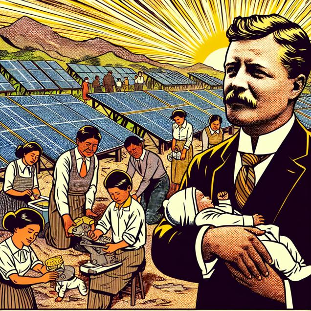 ChatGPT: Generate a 1960s comic-book-style illustration with dotted halftone patterns, depicting a sunlit town in Peru. Rows of solar panels bask in the warm glow, generating a significant amount of solar power. Among them, a group of friendly and determined Theodores can be seen discussing and working on the latest innovations in solar technology. Moving around the town, numerous parents are naming their newborns Theodore, inspired by the growing popularity of the name. As the Theodores grow up, they are dedicated to harnessing the power of the sun, contributing to the increasing prominence and impact of solar power generation in Peru.