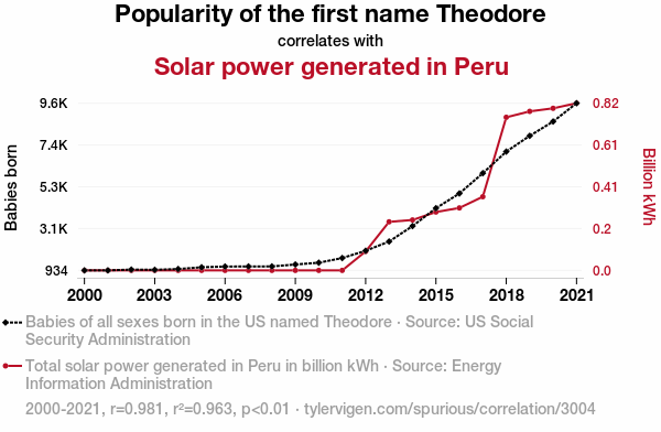 This means 96.3% of the change in the one variable (i.e., Solar power generated in Peru) is predictable based on the change in the other (i.e., Popularity of the first name Theodore) over the 22 years from 2000 through 2021.