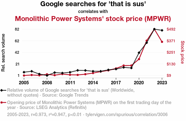 Google Trends, "that is sus" search, Monolithic Power Systems stock price, MPWR stock price correlation, internet search trends, financial markets, stock price movements, LSEG Analytics, Refinitiv, correlation coefficient, p-value, pop culture phrase, stock price fluctuations