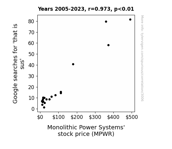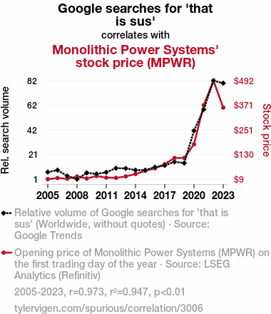 User prompt: Please provide potential search keywords for a paper titled That is Sus Google Search Buzz: A Correlation with Monolithic Power Systems' Stock Fuzz with an abstract of This paper investigates the hitherto unforeseen association between Google searches for "that is sus" and the stock price movements of Monolithic Power Systems (MPWR). Leveraging data from Google Trends and LSEG Analytics (Refinitiv), our analysis spans the period 2005 to 2023. Our findings reveal a remarkably sturdy correlation coefficient of 0.9730311 and a p-value less than 0.01, indicating a strong link between the popularity of the pop culture phrase "that is sus" and the fluctuations in MPWR's stock price. Our analysis showcases an unconventional but compelling discovery, shedding light on the cryptic interplay between internet search trends and financial markets.