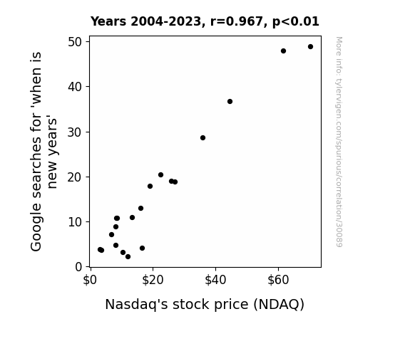 This means 93.6% of the change in the one variable (i.e., Nasdaq's stock price (NDAQ)) is predictable based on the change in the other (i.e., Google searches for 'when is new years') over the 20 years from 2004 through 2023.