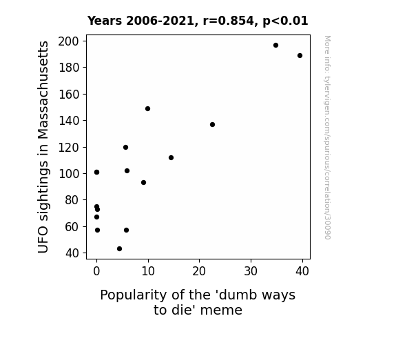 This means 72.9% of the change in the one variable (i.e., Popularity of the 'dumb ways to die' meme) is predictable based on the change in the other (i.e., UFO sightings in Massachusetts) over the 16 years from 2006 through 2021.