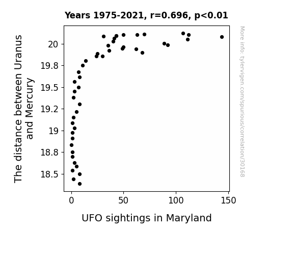 This means 48.5% of the change in the one variable (i.e., UFO sightings in Maryland) is predictable based on the change in the other (i.e., The distance between Uranus and Mercury) over the 47 years from 1975 through 2021.