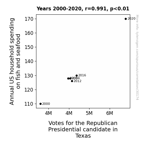 This means 98.3% of the change in the one variable (i.e., Votes for the Republican Presidential candidate in Texas) is predictable based on the change in the other (i.e., Annual US household spending on fish and seafood) over the 6 years from 2000 through 2020.