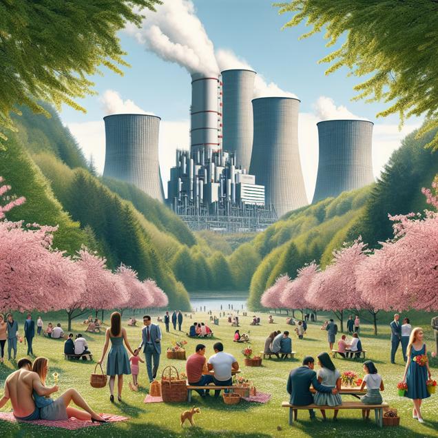 Prompt: Generate an image showing a picturesque park in Romania where couples are picnicking and strolling beneath blooming Romeo flower trees. In the background, feature a sleek modern nuclear power plant towering amidst the landscape, emitting gentle steam from its cooling towers. The unique scene should convey a harmonious blend of nature's romantic charm and cutting-edge high-tech infrastructure. The depiction should include only scenes, people, and objects, it should not include text or speech bubbles.