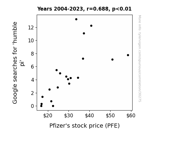 This means 47.4% of the change in the one variable (i.e., Pfizer's stock price (PFE)) is predictable based on the change in the other (i.e., Google searches for 'humble pi') over the 20 years from 2004 through 2023.
