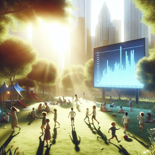 Prompt: Generate an image of a serene park scene, capturing the joyous atmosphere as children play and laugh amidst lush greenery. The sunlight bathes the surroundings in a warm glow, casting long shadows and illuminating the happiness on the children's faces. In the backdrop, a digital ticker prominently displays the rising stock price of Republic Services (RSG), reflecting the optimistic and confident mood of investors in this idyllic setting. The focus should be on the lively activities in the park, with the ticker subtly integrated into the scene. The depiction should include only scenes, people, and objects, it should not include text or speech bubbles.