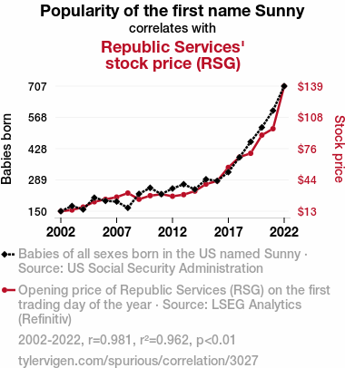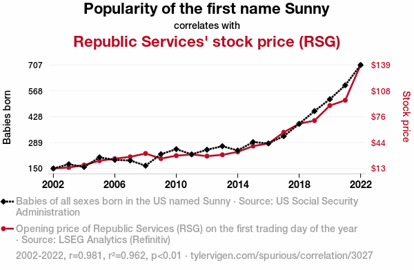 A linear line chart with years as the X-axis and two variables on the Y-axis. The first variable is Popularity of the first name Sunny and the second variable is Republic Services' stock price (RSG).  The chart goes from 2002 to 2022, and the two variables track closely in value over that time. Small Image