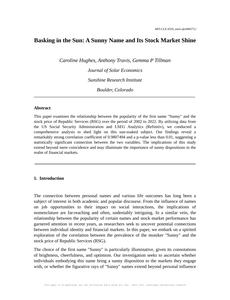 User prompt: Please provide potential search keywords for a paper titled Basking in the Sun: A Sunny Name and Its Stock Market Shine with an abstract of This paper examines the relationship between the popularity of the first name "Sunny" and the stock price of Republic Services (RSG) over the period of 2002 to 2022. By utilizing data from the US Social Security Administration and LSEG Analytics (Refinitiv), we conducted a comprehensive analysis to shed light on this sun-soaked subject. Our findings reveal a remarkably strong correlation coefficient of 0.9807494 and a p-value less than 0.01, suggesting a statistically significant connection between the two variables. The implications of this study extend beyond mere coincidence and may illuminate the importance of sunny dispositions in the realm of financial markets.