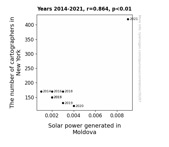 This means 74.7% of the change in the one variable (i.e., Solar power generated in Moldova) is predictable based on the change in the other (i.e., The number of cartographers in New York) over the 8 years from 2014 through 2021.