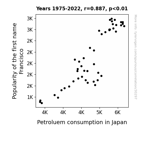 This means 78.6% of the change in the one variable (i.e., Petroluem consumption in Japan) is predictable based on the change in the other (i.e., Popularity of the first name Francisco) over the 48 years from 1975 through 2022.