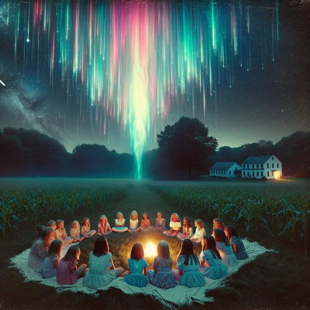 Prompt: [ a Polaroid photo ] In a small town in Maryland, a group of young girls named Annabelle gathered in a field beneath the night sky. They giggled and chatted as they shared stories about UFO sightings in the area. Suddenly, a bright light appeared overhead, and colorful streaks of light danced across the sky, captivating the wide-eyed Annabelles. It seemed that the popularity of the name Annabelle had indeed attracted some unexpected visitors from outer space to Maryland. Enhanced visual: A retro-style Polaroid photo capturing the girls sitting in a circle on a blanket in a tranquil field, under a starry night sky. A mesmerizing burst of colorful lights and streaks illuminate the sky overhead, casting a dreamy glow on the girls' delighted faces. The atmosphere is filled with a sense of wonder and enchantment, transporting the viewer to a magical moment in the small town. The depiction should include only scenes, people, and objects, it should not include text or speech bubbles.
