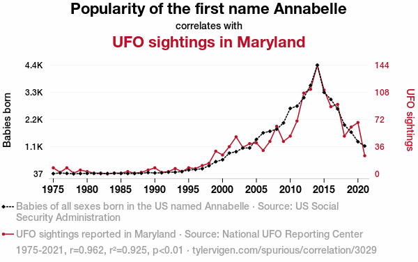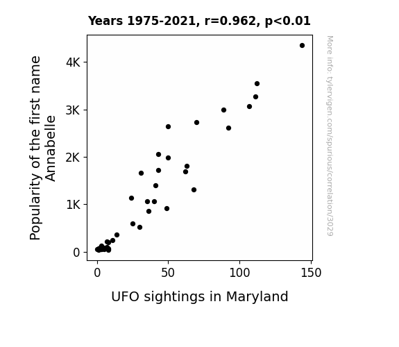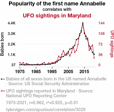 This means 92.5% of the change in the one variable (i.e., UFO sightings in Maryland) is predictable based on the change in the other (i.e., Popularity of the first name Annabelle) over the 47 years from 1975 through 2021.