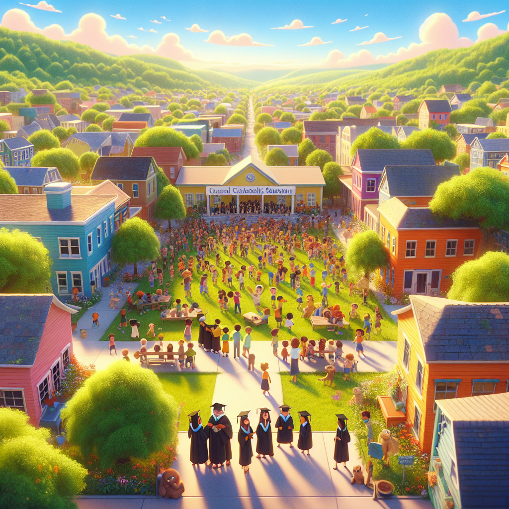 Prompt: An image that looks like it is a scene from a Pixar movie: Under a clear blue sky, a vibrant town is brought to life with colorful buildings and joyful green spaces. Children are seen playing in lush, open parks, surrounded by trees and blooming flowers. The town exudes a sense of community and happiness, as families enjoy the fresh, clean air together. In the distance, a small graduation ceremony is taking place, where individuals are being awarded their Master's degrees in Architecture and related services. The scene captures the beauty of a town thriving with nature and the spirit of accomplishment. The depiction should include only scenes, people, and objects, it should not include text or speech bubbles.