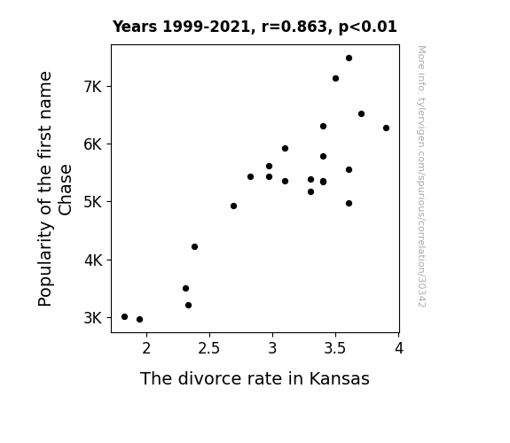 This means 74.5% of the change in the one variable (i.e., The divorce rate in Kansas) is predictable based on the change in the other (i.e., Popularity of the first name Chase) over the 23 years from 1999 through 2021.