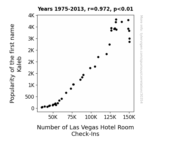 This means 94.5% of the change in the one variable (i.e., Number of Las Vegas Hotel Room Check-Ins) is predictable based on the change in the other (i.e., Popularity of the first name Kaleb) over the 39 years from 1975 through 2013.