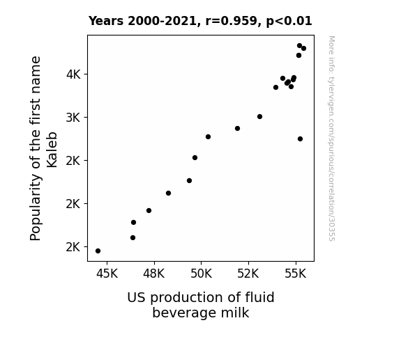 This means 92% of the change in the one variable (i.e., US production of fluid beverage milk) is predictable based on the change in the other (i.e., Popularity of the first name Kaleb) over the 22 years from 2000 through 2021.