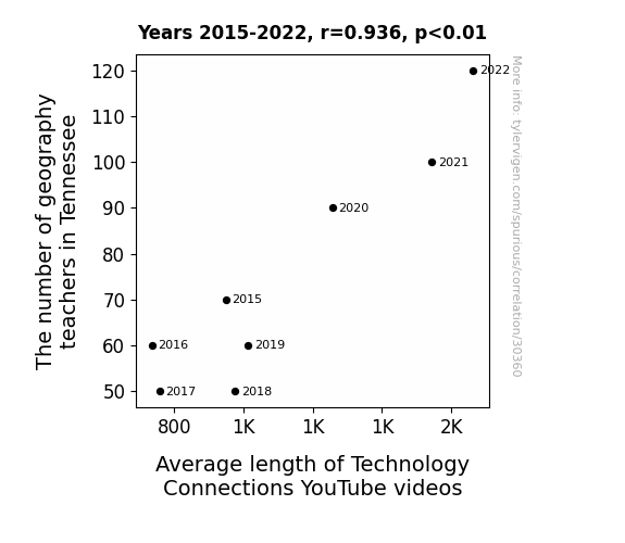 This means 87.7% of the change in the one variable (i.e., Average length of Technology Connections YouTube videos) is predictable based on the change in the other (i.e., The number of geography teachers in Tennessee) over the 8 years from 2015 through 2022.