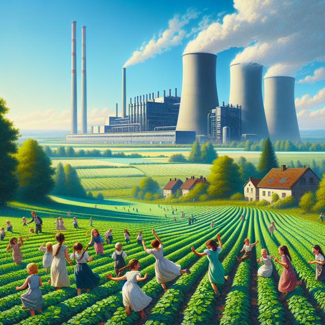 Prompt: Generate an image of a picturesque sunny day in Hungary, where a vibrant field of green crops sways gently in the breeze. Among the crops, a group of little girls named Eva play joyfully, their laughter echoing through the air. In the background, a towering biomass power plant hums with activity, its chimneys releasing wisps of clean white steam into the clear blue sky. The Evas' presence infuses the scene with a sense of renewed energy, symbolizing the connection between the popularity of the name Eva and the generation of biomass power in Hungary. The depiction should include only scenes, people, and objects, it should not include text or speech bubbles.