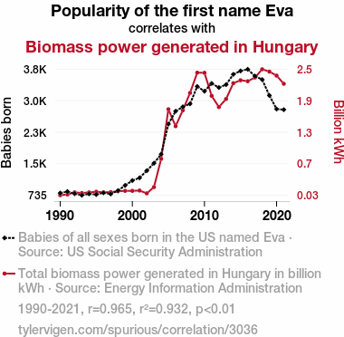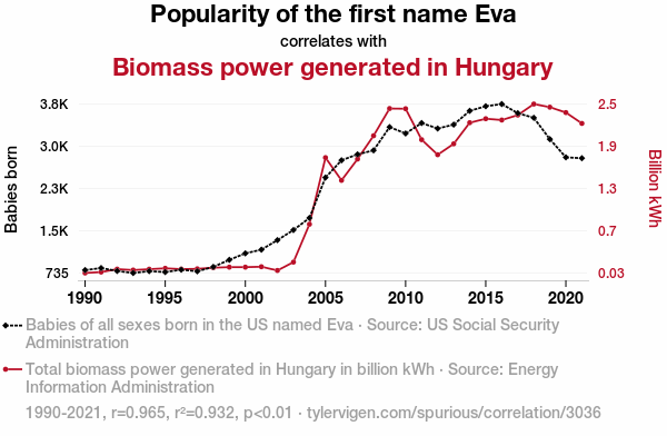 This means 93.2% of the change in the one variable (i.e., Biomass power generated in Hungary) is predictable based on the change in the other (i.e., Popularity of the first name Eva) over the 32 years from 1990 through 2021.