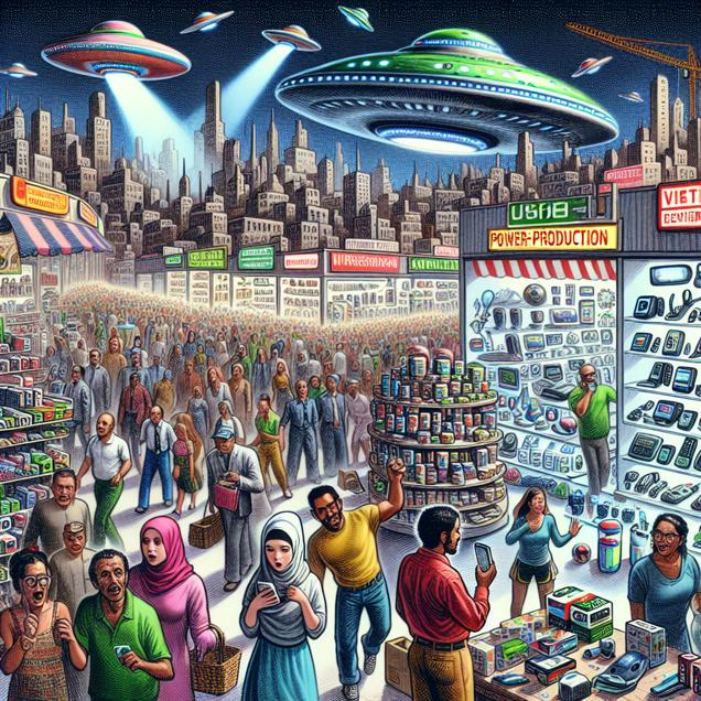 ChatGPT: In a bustling Ohio town, colorful UFO-themed merchandise fills the shelves of a local store, attracting excited customers. Meanwhile, in Yemen, the skyline is dotted with construction cranes as new electricity generation infrastructure springs up, powering the alien-inspired gadgets that have suddenly surged in demand.