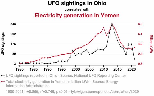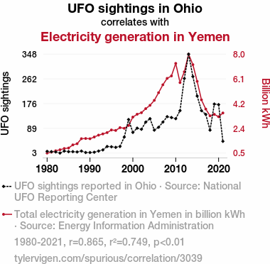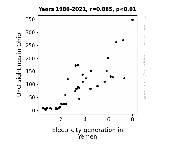 This means 74.9% of the change in the one variable (i.e., Electricity generation in Yemen) is predictable based on the change in the other (i.e., UFO sightings in Ohio) over the 42 years from 1980 through 2021.