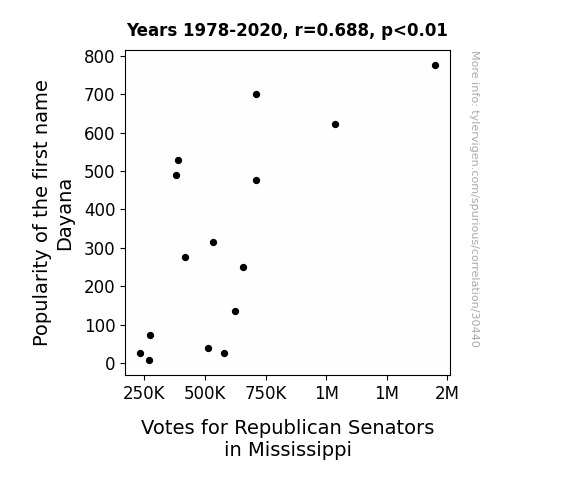 This means 47.4% of the change in the one variable (i.e., Votes for Republican Senators in Mississippi) is predictable based on the change in the other (i.e., Popularity of the first name Dayana) over the 15 years from 1978 through 2020.